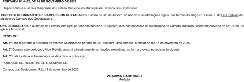 O prefeito de Campos dos Goytacazes, Wladimir Garotinho (PP), ficará ausente dos trabalhos do Executivo Municipal por um período de 14 dias de folga. A formalização dessa ausência foi publicada no Diário Oficial desta sexta-feira (14), por meio da Portaria Nº 4482.