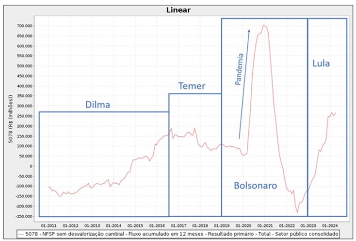 Quando o gráfico acima encontra-se abaixo de zero, significa que o governo está poupando recursos; quando está acima, significa que ele está gastando mais do que arrecadando. O governo Lula 3 está criando um déficit (em termos nominais) maior do que os tempos da Dilma e, por enquanto, não há no radar do mercado algo que mude essa trajetória.